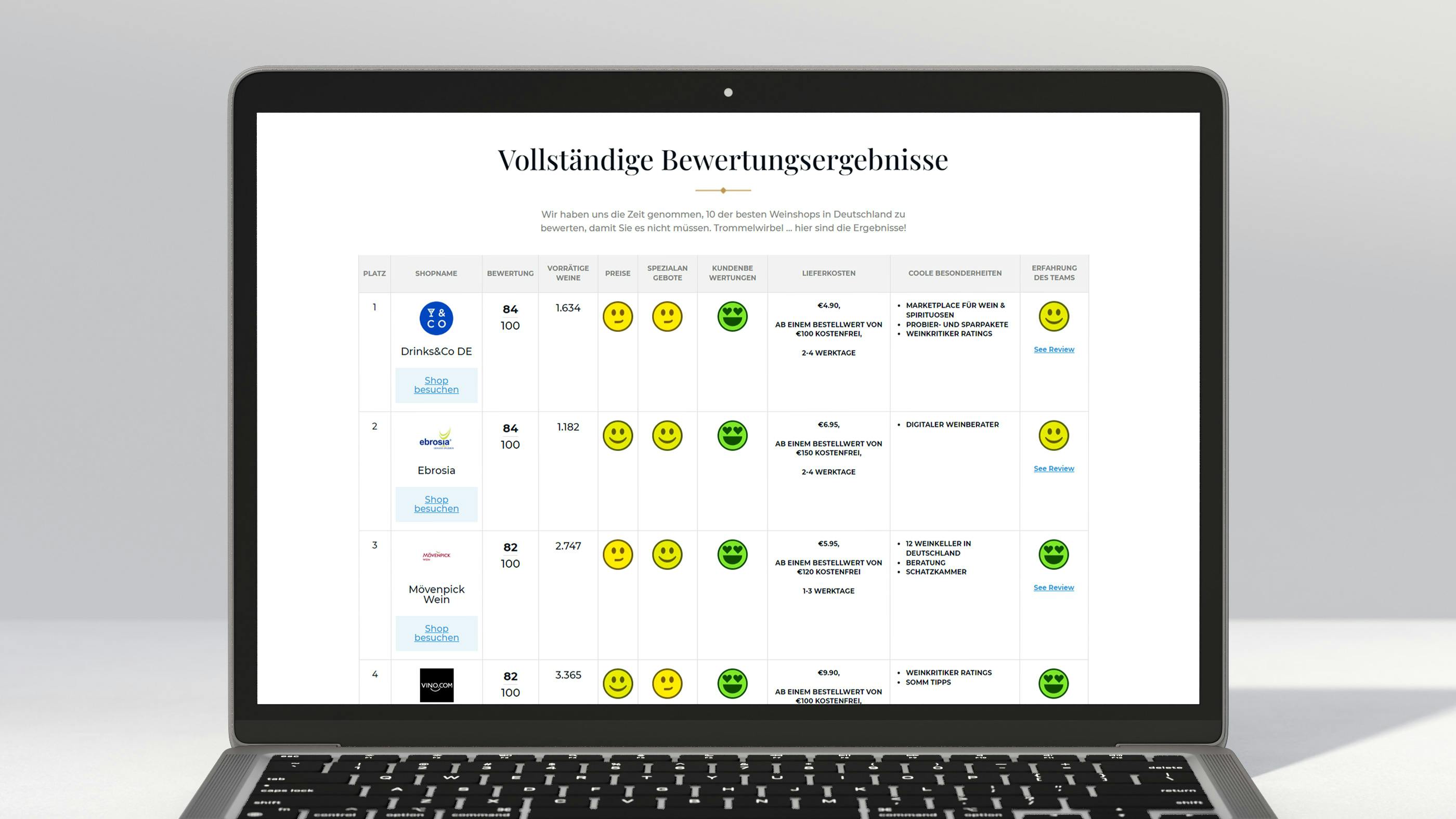 Online-Vinotheken.de is a hobby project that offers wine aficionados and casual buyers alike a rating of German online wine shops. The rating is based on 8 different factors and currently includes 11 prominent stores operating in Germany with more to come soon. Cheers!
